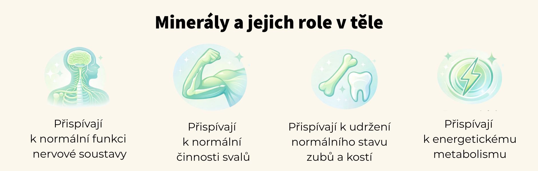 Minerály se podílejí na řadě tělesných funkcí a přispívají k udržení normálního fungování organismu. I když tvoří jen malou část tělesné hmotnosti, jsou důležité pro různé tělesné funkce, kterých se účastní. Bez minerálních látek v těle by neprobíhala řada klíčových procesů, jako je regulace nervové soustavy, svalová kontrakce nebo udržení vnitřní rovnováhy.
