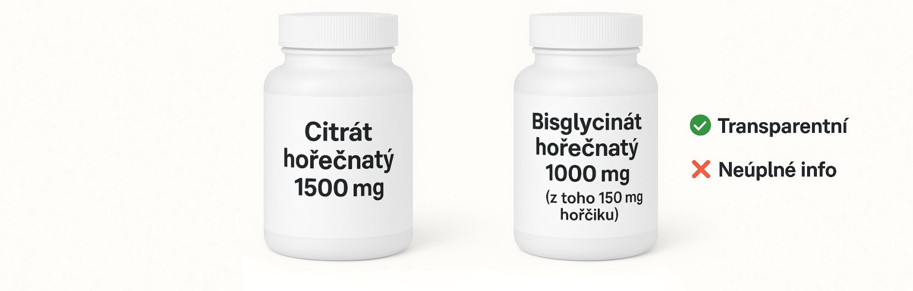 - „Citrát hořečnatý 1500 mg“ ❌ bez uvedení elementárního Mg nevíte, kolik hořčíku přijímáte