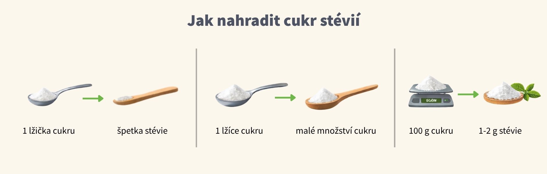 - 100 g cukru = cca 1–2 g stévie