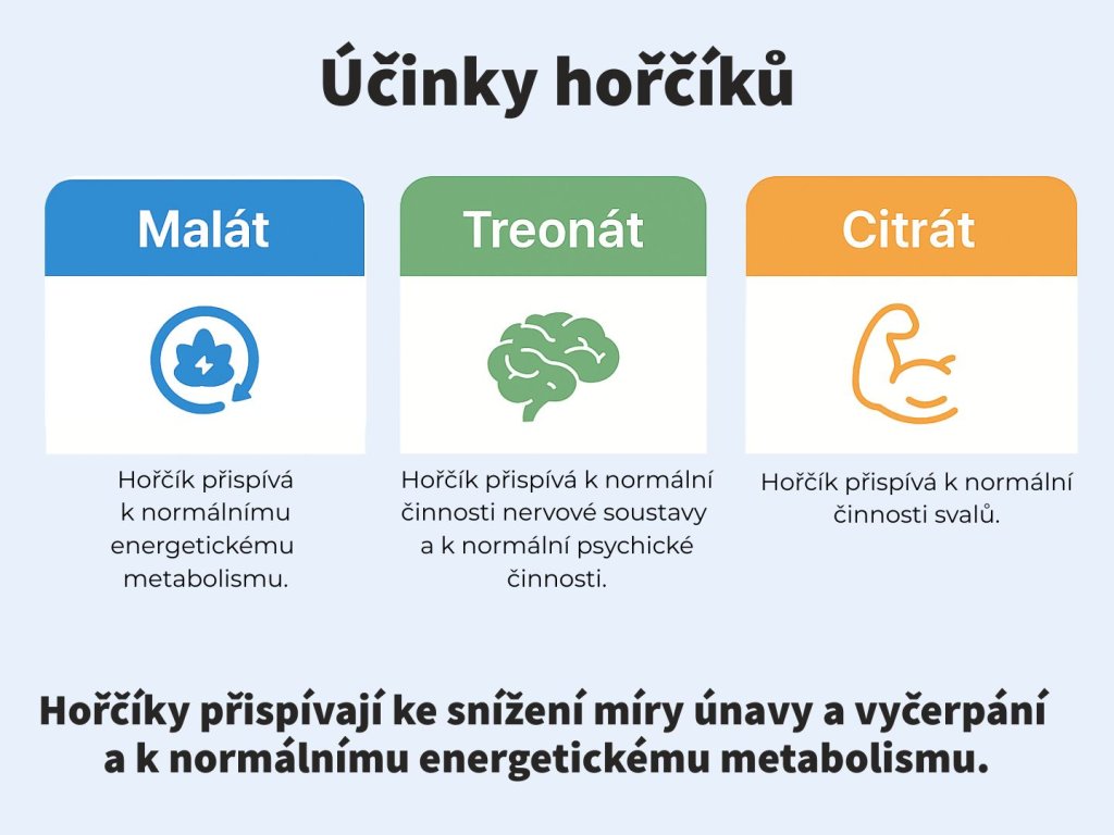 | Zdravotní tvrzení: | Hořčík přispívá ke snížení míry únavy a vyčerpání; Hořčík přispívá k elektrolytické rovnováze; Hořčík přispívá k normálnímu energetickému metabolismu; Hořčík přispívá k normální činnosti nervové soustavy; Hořčík přispívá k normální činnosti svalů; Hořčík přispívá k normální syntéze bílkovin; Hořčík přispívá k normální psychické činnosti; Hořčík přispívá k udržení normálního stavu kostí; Hořčík přispívá k udržení normálního stavu zubů; Hořčík se podílí na procesu dělení buněk |
