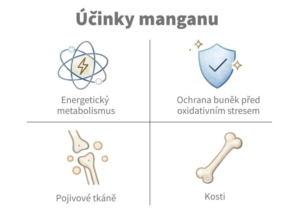 | Schválená zdravotní tvrzení: | Mangan přispívá k normálnímu energetickému metabolismu; Mangan přispívá k udržení normálního stavu kostí; Mangan přispívá k normální tvorbě pojivových tkání; Mangan přispívá k ochraně buněk před oxidativním stresem |