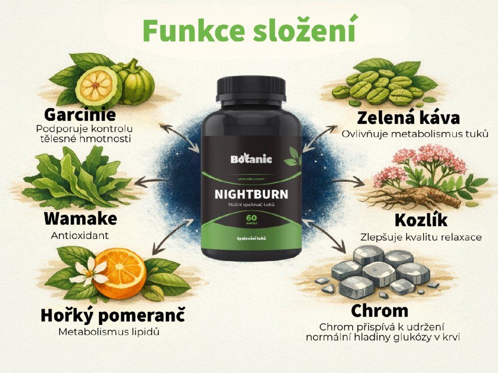 Noční spalovač tuků NightBurn je doplněk stravy navržený pro večerní režim. Kombinace garcinie, zelené kávy bez kofeinu a dalších rostlinných extraktů je spojena s podporou metabolismu lipidů a kontrolou tělesné hmotnosti.