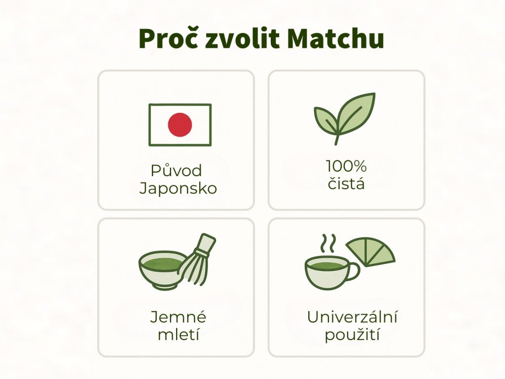 Tradičná japonská Matcha – jemne mletý zelený čaj v žiarivo zelenej farbe. Vychutnajte si jej plnú chuť, bohatú arómu a sviežu penu. Ideálne na prípravu čaju i obľúbeného Matcha latte.