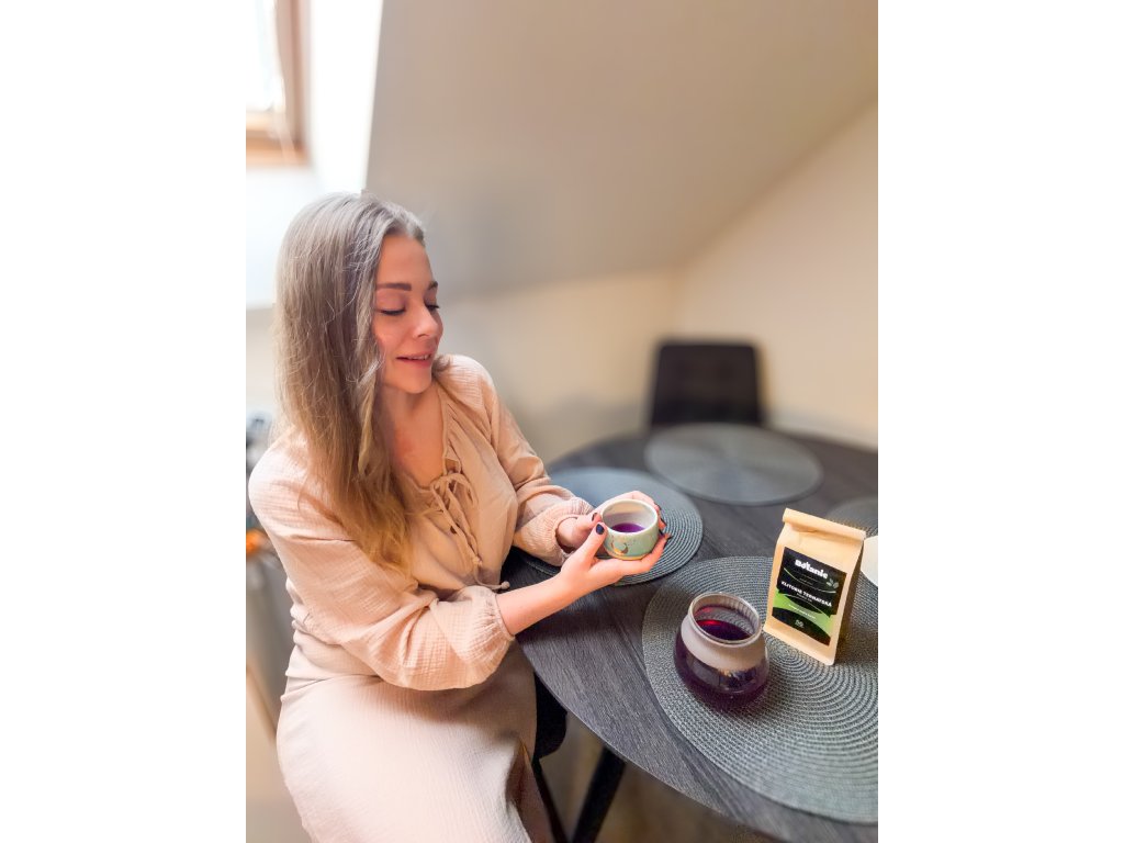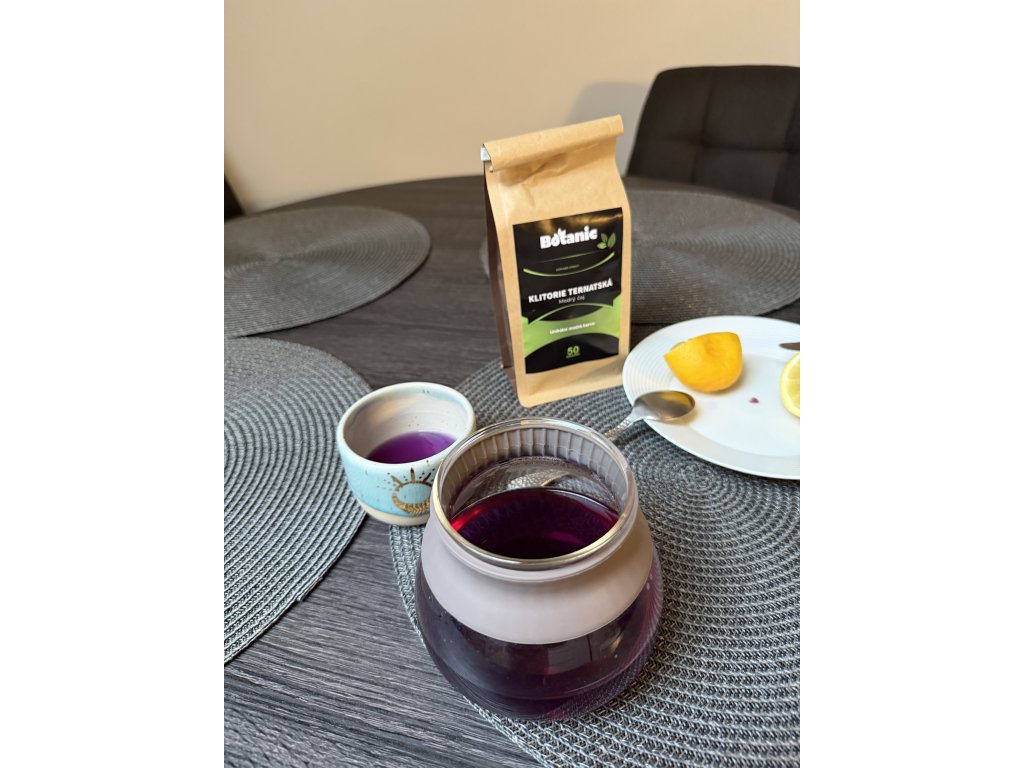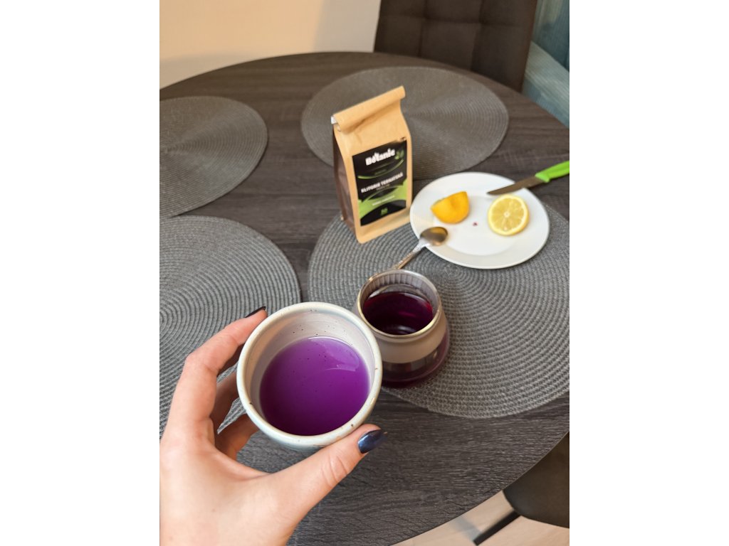 Objavte kúzlo modrého čaju z klitórie ternatskej. 100% prírodný bylinný nálev, ktorý po pridaní citrónu premení svoju sýto modrú farbu na fialovú. Jedinečný rituál, ktorý poteší všetky zmysly.