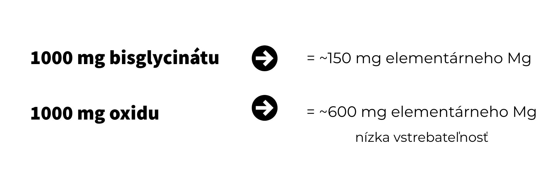 - 1000 mg oxidu horečnatého obsahuje až 600 mg elementárneho Mg, ale jeho vstrebateľnosť je nižšia než u iných foriem ako je bisglycinát